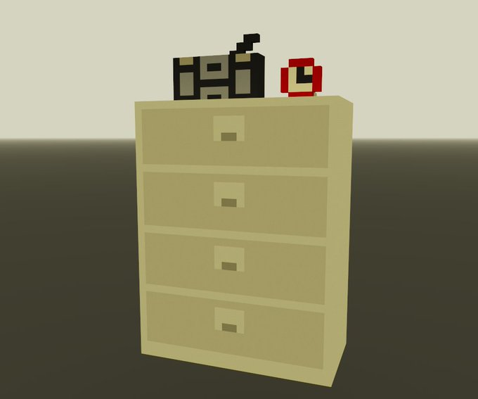 タンスとハンガーにかけたタオル タンスの上は、ラジカセと目覚まし時計です。 絵の描けない自分には、ボクセル数が細か過ぎると手に負えないし、粗過ぎると1ボクセルの配置にセンスが問われる。 ドット絵にも通じるところが多いなーと思います。 #voxelart #ボクセルアート #タンス #タオル