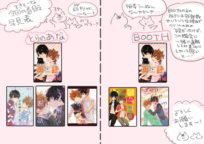 6 30 再録本を本日とらさんに発送したんですが、すでに予約始まってるので慌てて描きました。 既刊もついでに再納品したんですがとらさんとBOOTHでは取り扱い種類が違います。って表です(雑) 20/06/29 20:33