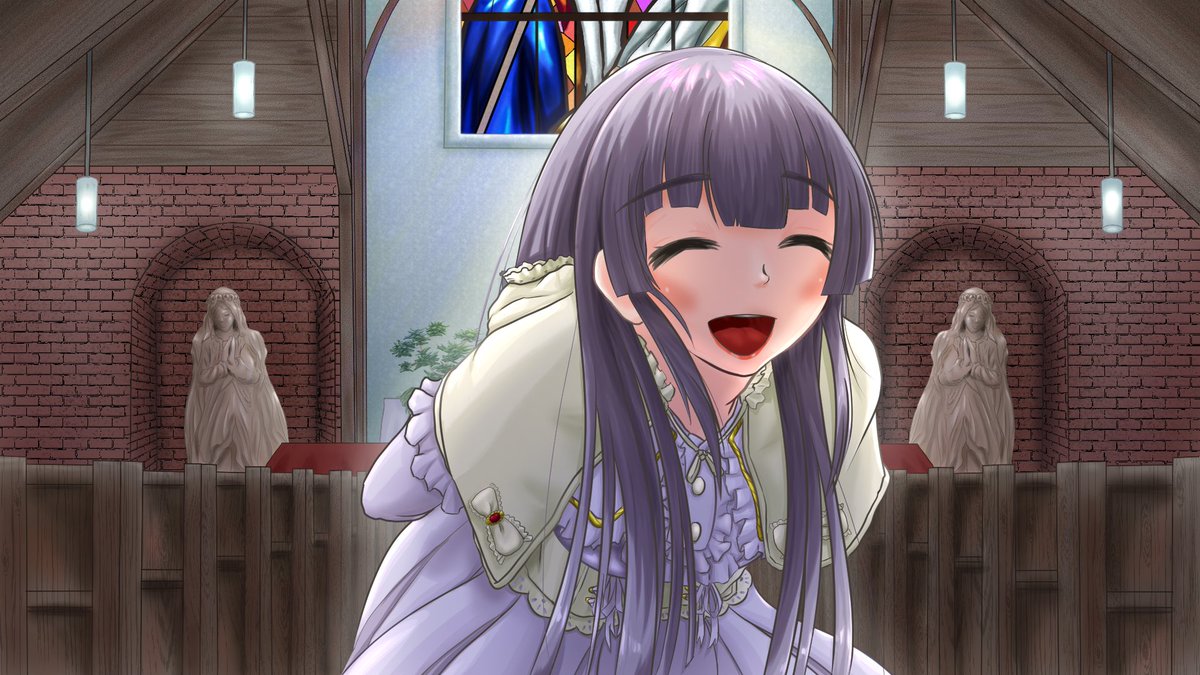 #mamayo_ART #大河山麻々夜降臨記念祭 2枚目 なんてね、あはは! 教会に合わせて白い服着てきたんだ、想像しやすいでしょ? …ありがとう、きっと君もタキシード似合うよ! 3枚目 どうせなら…誓いのキスの練習でもしておく? そんな感じ あと、背景素材。使用や色調調整等ご要望があれば対応します