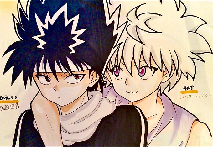 7 50 5年前に描いてたイラスト集(ノート) が発見して中の1枚目を見たら 幽遊白書の飛影と HUNTER×HUNTERのキルアの 絡んでる絵だった^ ^w #HunterXHunter #幽遊白書 #キルア #飛影 #イラスト #漫画 22/09/06 23:35
