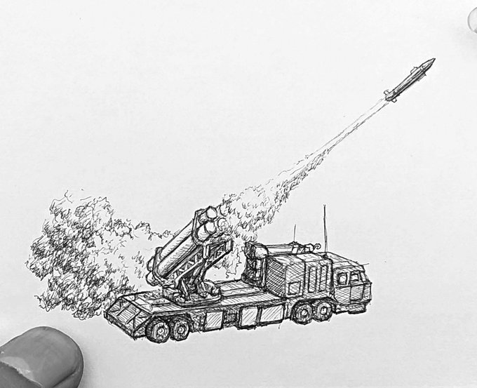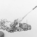 大型の多連装ロケット砲(*´ω`*) 武装は東側、車体は西側の折衷型。 中東とか東欧とかあたりが作りそう。 #ボールペン画 #落書き #イラスト #ロケット砲