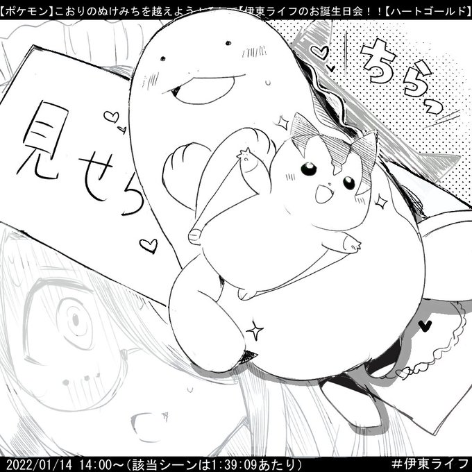 63 313 モチーフ考察失敗?!と思いきや目が完全一致で配色も一緒で展開面白かったです!! #絵東ライフ 可愛いライフ先生+可愛いポケモン+可愛いライフ産ポケモンで可愛いのドカ盛り!が描いていて楽しくて…… 22/12/01 19:32