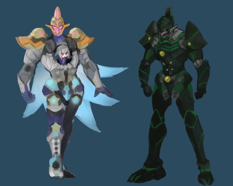 ラクガキでお試しに厚塗りっぽく適当に描いてみた 悲しみのチャイカアーマーとヘルエスタアーマー リゼの髪がマントみたいになってるのいいよね #お花畑青空大写生大会 #ヘル絵スタ