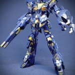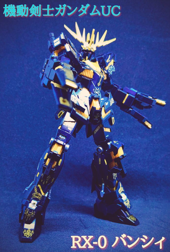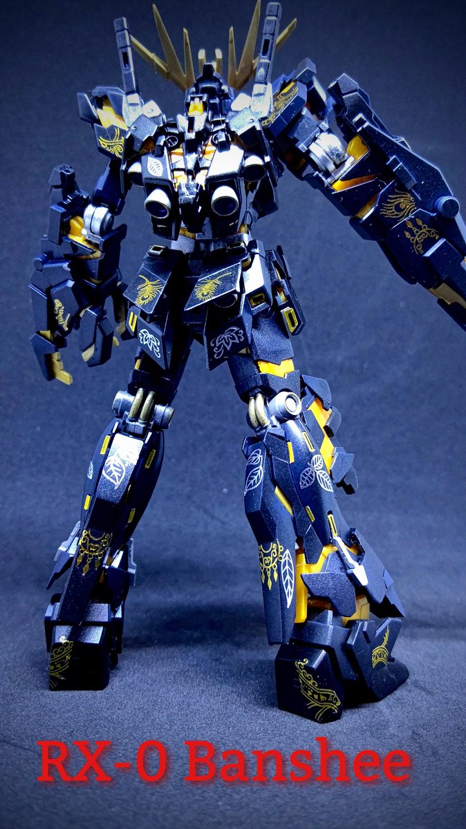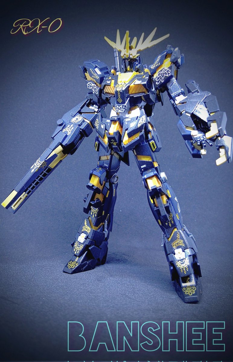 HG #バンシィ 完成しました🎵 黒を基調として、半艶消しのトップコート仕上げ。 簡易撮影ブースの都合、紺色っぽく映っております。 今回のネイルステッカーは、金と銀の単色柄のみ使用してみました。 #ガンダムユニコーン #ガンプラ好きと繋がりたい #ガンプラの画像貼るとRTされると聞いて