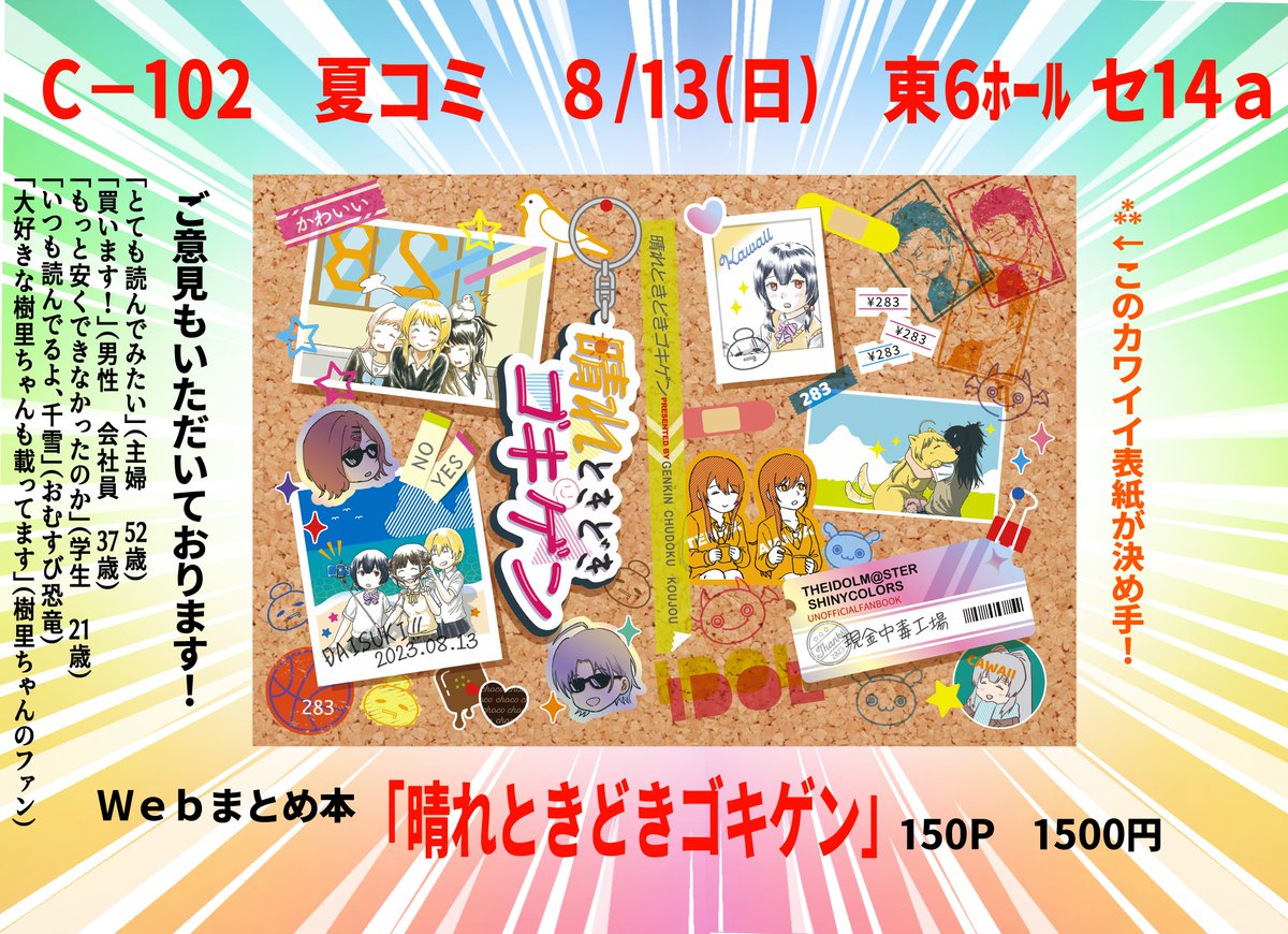55 87 #C102 新刊おしながきです。 まとめ本「晴れときどきゴキゲン」150P 1500円 今まで描いた漫画などをまとめました。 よろしくお願いいたします。 23/08/03 18:59