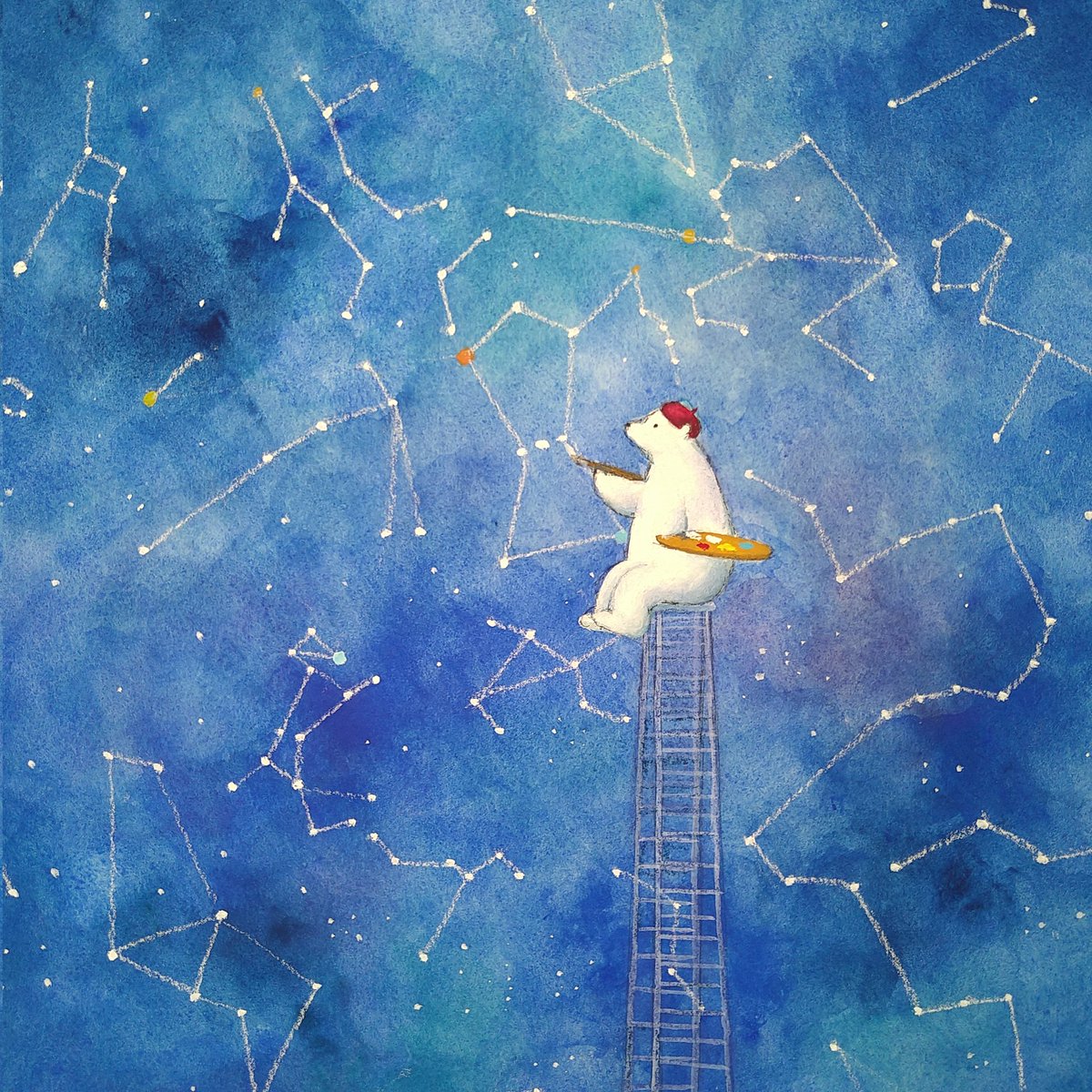 星座屋さん 気楽に描き始めたら、はっきり形がわかる星座は2、3個で子供の図鑑とスマホ片手に描くハメに🥲 本によってはビミョーに形が違うものもあり眼精疲労気味…。 #アナログ絵 #アクリルガッシュ #パステル #冬の星座 #絵柄が好みって人がいればいいなぁ