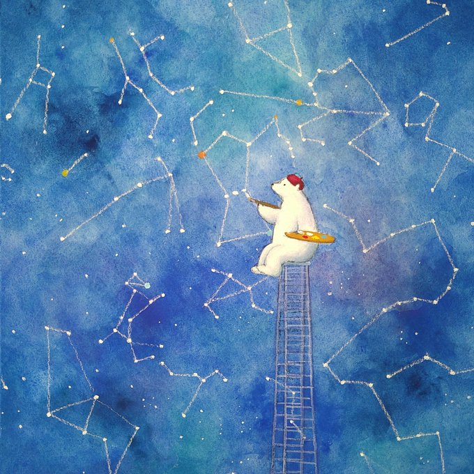16 183 星座屋さん 気楽に描き始めたら、はっきり形がわかる星座は2、3個で子供の図鑑とスマホ片手に描くハメに🥲 本によってはビミョーに形が違うものもあり眼精疲労気味…。 #アナログ絵 #アクリルガッシュ #パステル #冬の星座 #絵柄が好みって人がいればいいなぁ 23/01/09 14:55