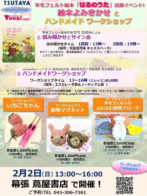 当日枠もありますが、ご予約頂けますと、確実にアイテムをお取り置きできますよ。 羊毛フェルト絵本「はるのうた」出版イベント 絵本よみきかせとハンドメイドワークショップ tsutayaevent.jp/tsutaya/open/o… #蔦屋書店 #もちなおみ #minamiwa #ニットカフェ #あみぐるみ #羊毛フェルト
