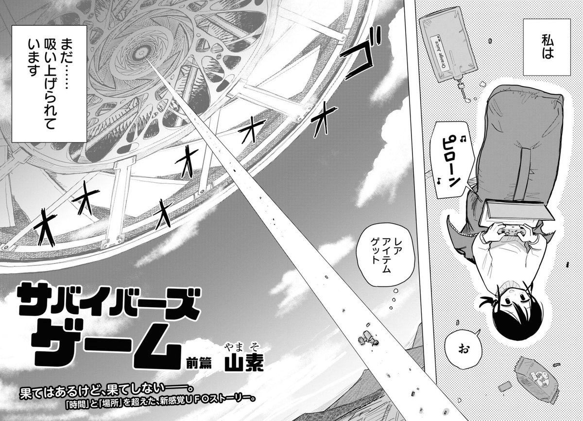 196 950 今日発売のコミックビーム7月号にサバイバーズゲームという読み切りの前編が載ってます 超低速巨大UFOに吸い上げられたゲーマー少女が12年間の空中生活をする奮闘記です よろしくお願いします! 23/06/12 11:05