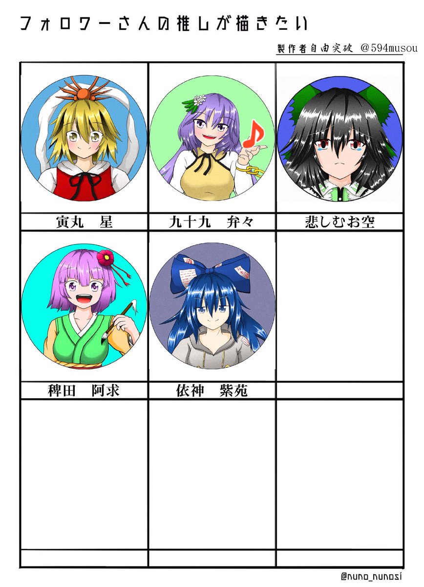 今月は描いた枚数がとても少ないが、その分エネルギーを1枚に込めたので、かなり手応えがあった!色々な企画に参加できたので、次回も参加できるように引き続き頑張ります。 #今月描いた絵を晒そう #東方Project #霊烏路空 #鈴仙・優曇華院・イナバ #九十九弁々 #九十九八橋 #自由突破カラー絵修行