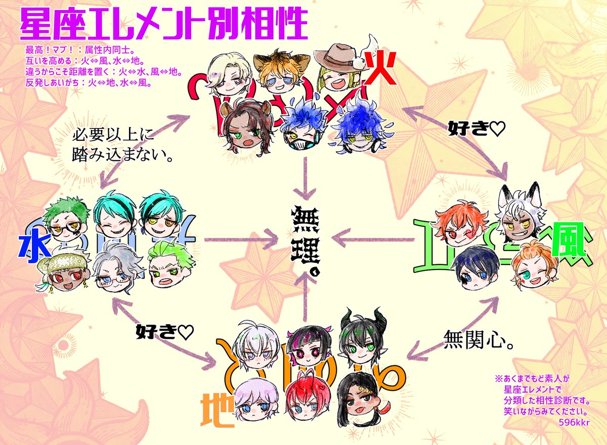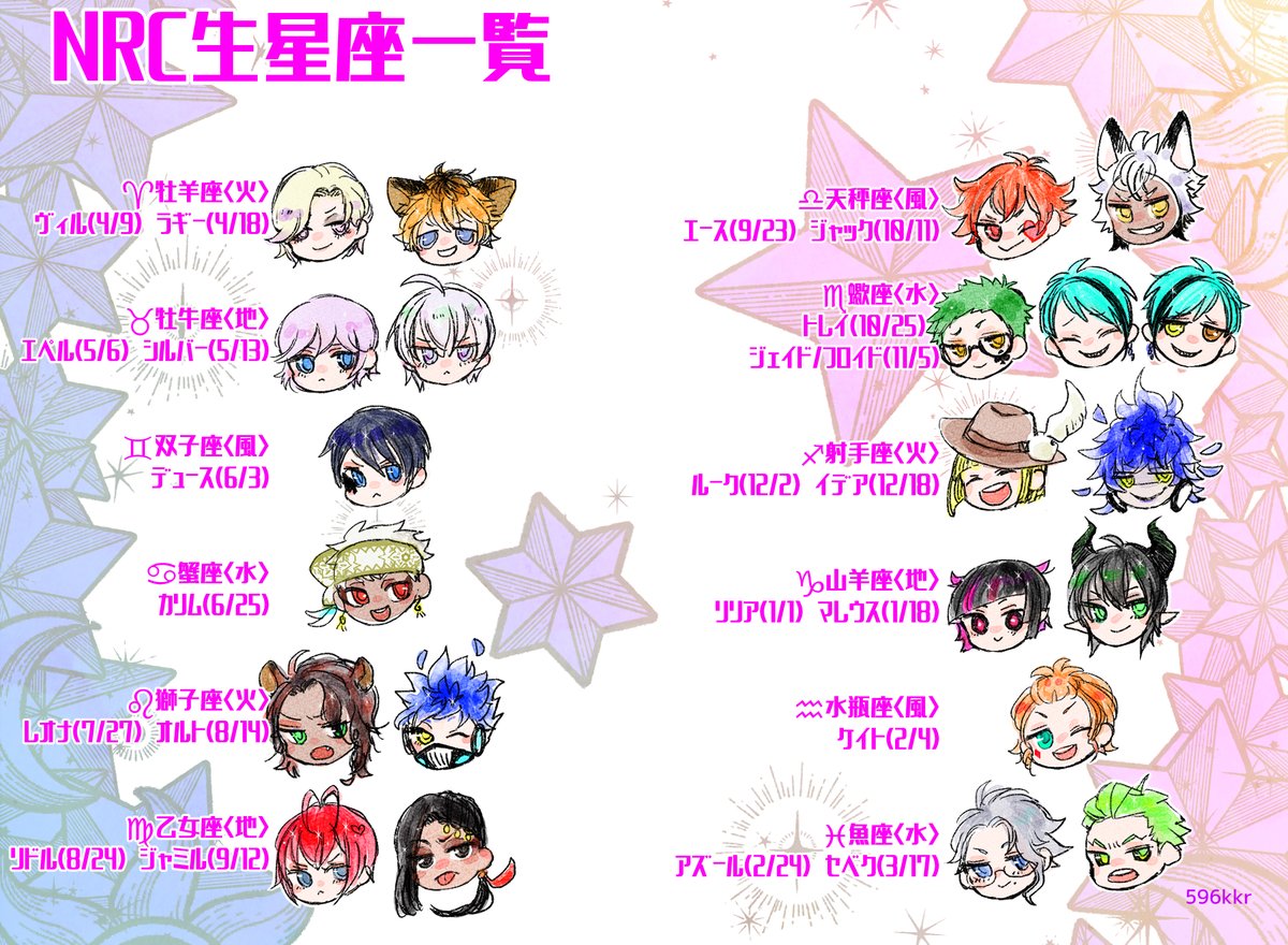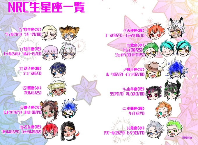 ど素人ですが、NRC生徒の星座相性一覧作ってたんだけども!「わかる…!!!」ばかりで面白かったのでお裾分け! ポム三年とエペルとか、レオナとマレウスは笑った。水チームと地チームの相性は良いはずなんだけど、水→→→地って気がする。 #ツイステファンアート #twstファンアート
