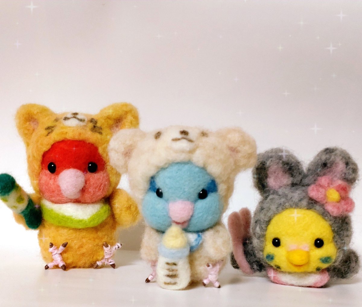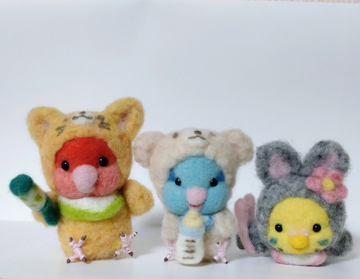 羊毛フェルトで着ぐるみベビーのマメルリハ、コザクラインコ、セキセイインコを作りましたよ✨ 作ったのは8月ですが😅 #羊毛フェルト