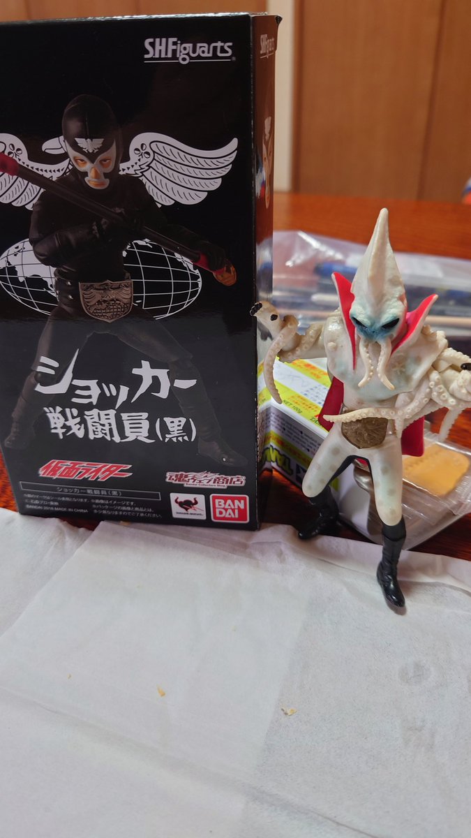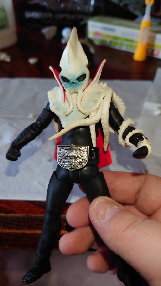 ずっとやりたかったショッカー怪人造り……材料が揃ったから1番手は大好きなイカを(笑) …まだ、全然出来てないけどもう疲れた(笑)メモリアルの材質的にピンバイスで穴があかんのじゃ…(´;ω;`) #ニチアサフィギュア改造部 #Ksファクトリー