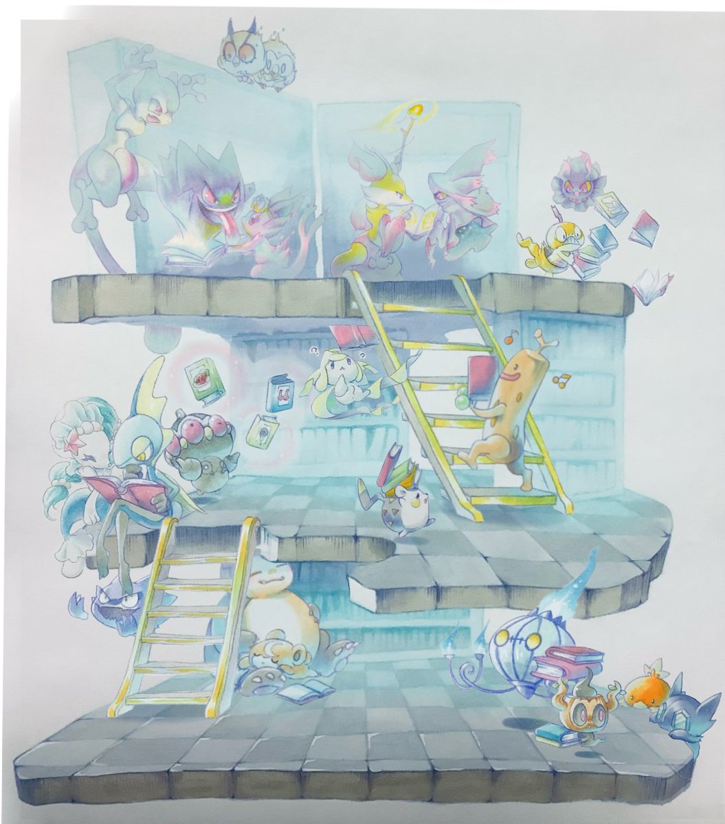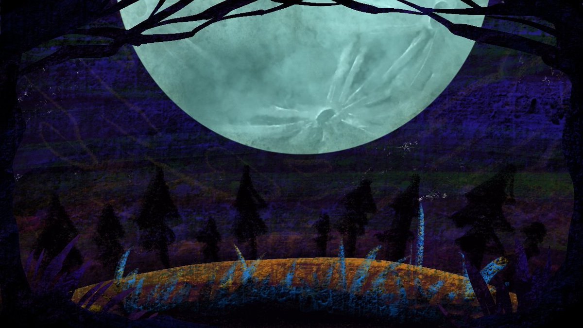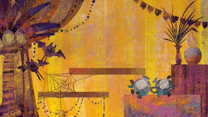 ②最初の背景! 方向性決まってなくて、難産だったー💦 厚塗り苦手だったので、何回も描き直してここに落ち着く! 楽しそうなんだけど、ちょっと不気味な色味目指しました🥳 #5Gポケハロウィン #ポケモンイラスト広場