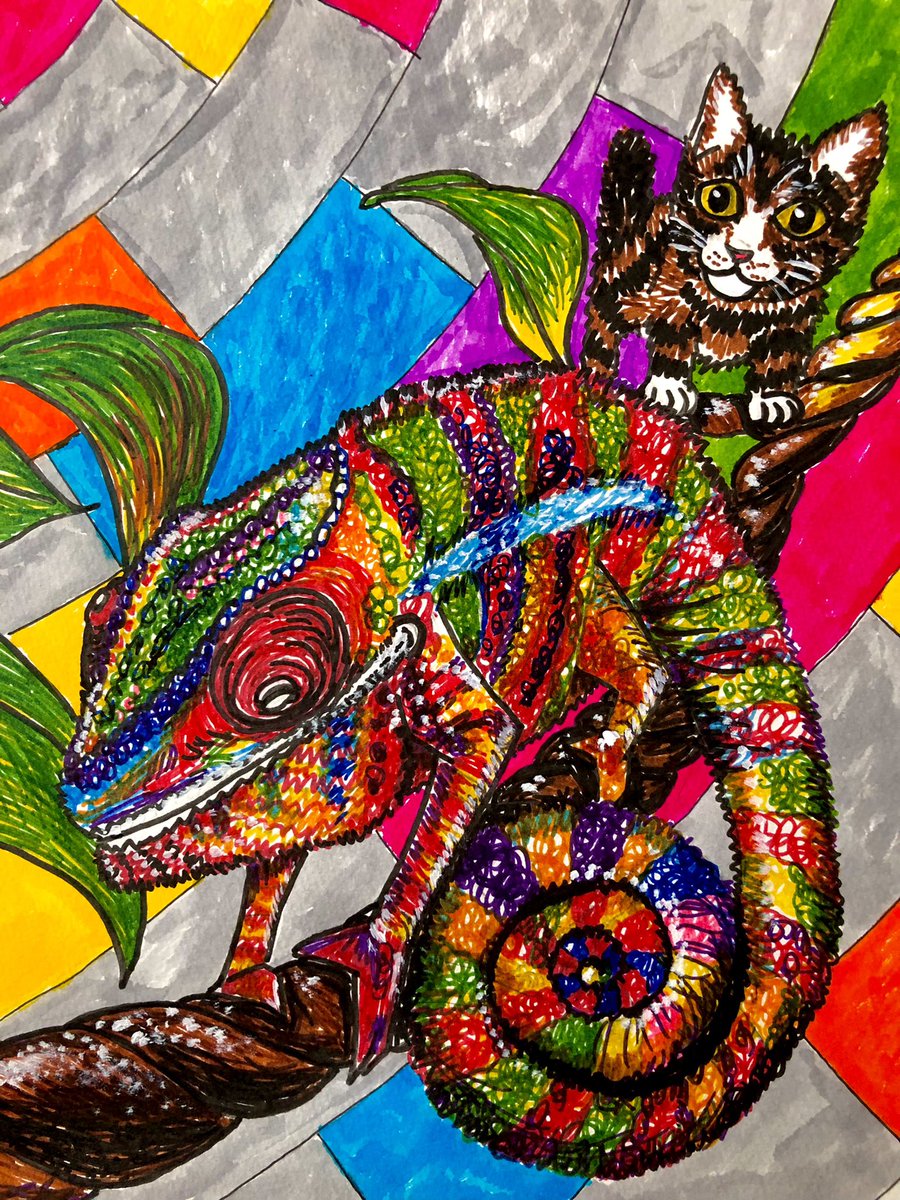きみはなにいろ? #カメレオンとにゃんこ #ペン画