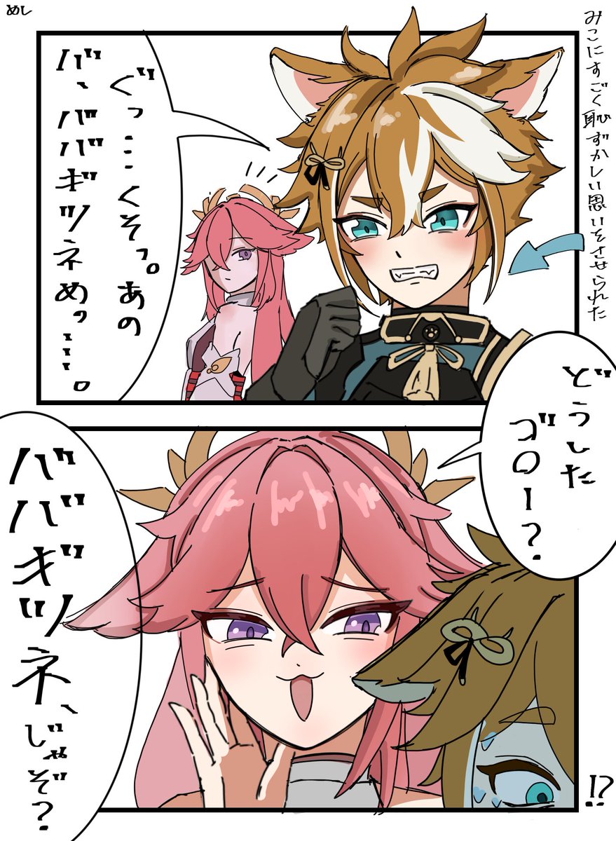 みこにこの顔をさせたかっただけの雑漫画🦊🐶 ⚠️ゴローのお口がちょっと悪いです、字が汚いです #原神イラスト #原神
