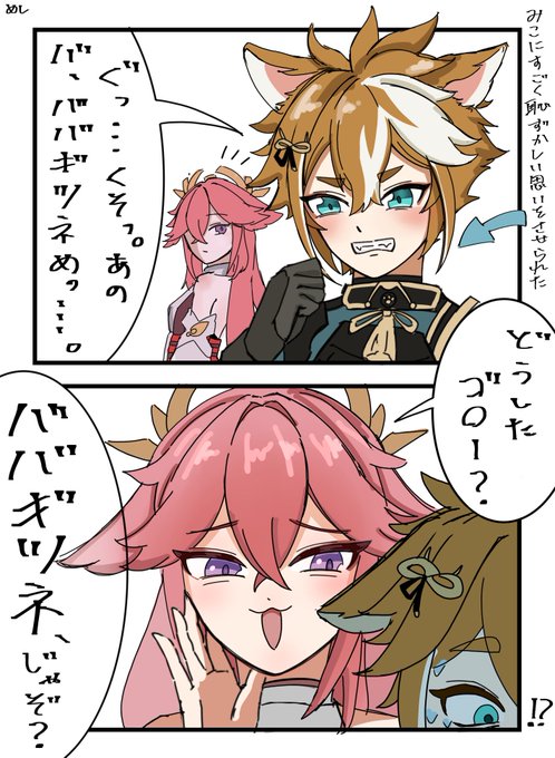 2 11 みこにこの顔をさせたかっただけの雑漫画🦊🐶 ⚠️ゴローのお口がちょっと悪いです、字が汚いです #原神イラスト #原神 23/04/21 08:44