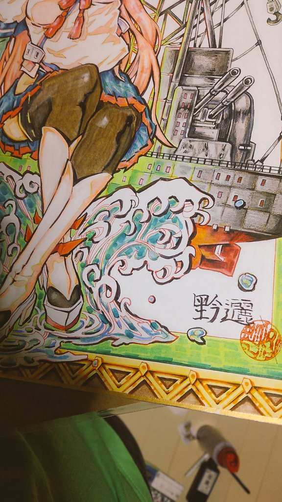 やっと終わったッス。髪の色の中に蛍光系入っているので全然画像に反映してない感じで暗く写ってるス。波と船は初めて描きました。コピペンV99で少し荒く線だし。ヤフオクで猫の餌代チャレンジいってきます。長々と見て頂きアザスm(_ _)m #艦これ #明石 #アナログイラスト