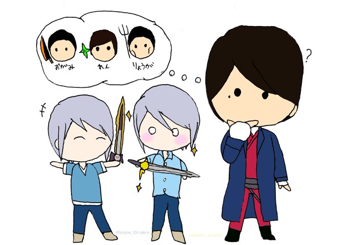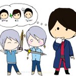 深鯨の賀屋身さん(@AtRaShi_KaYaShI )のちびけんとくんとうちの小神兄弟です⚔️ ちびけんとくん「『おがみ』で…『れん』と『りょうが』?」 廉「これが本物の雷鳴剣黄雷…!」 涼香「すげー!本物の闇黒剣月闇だ!!」 #イラスト