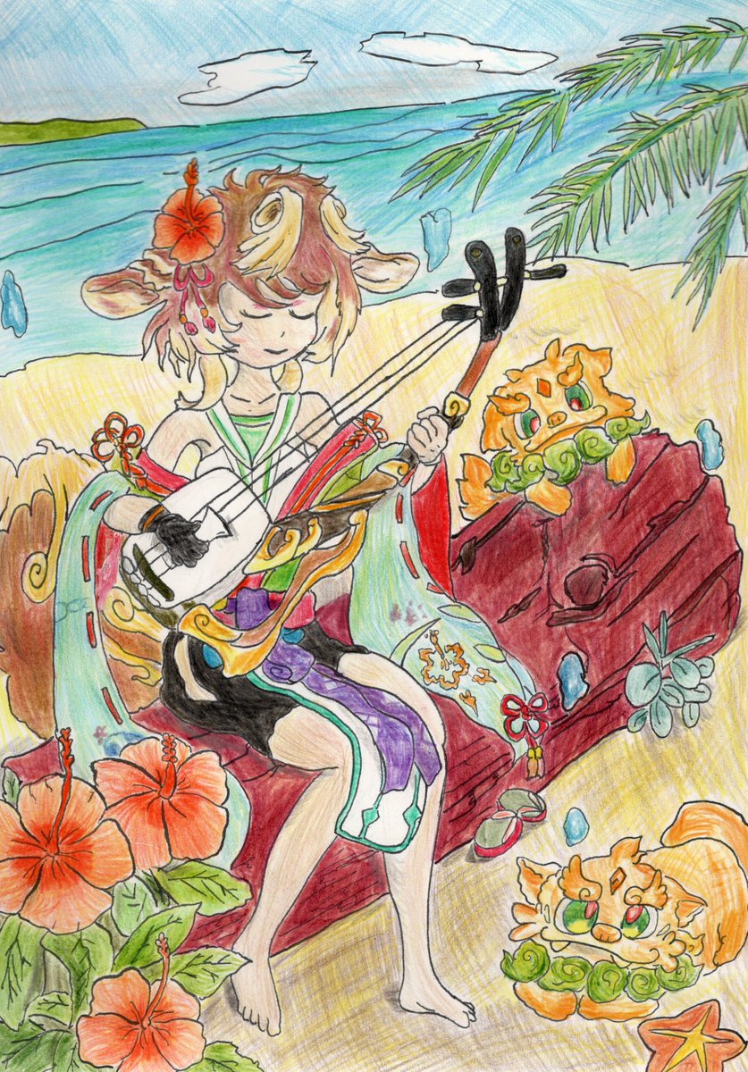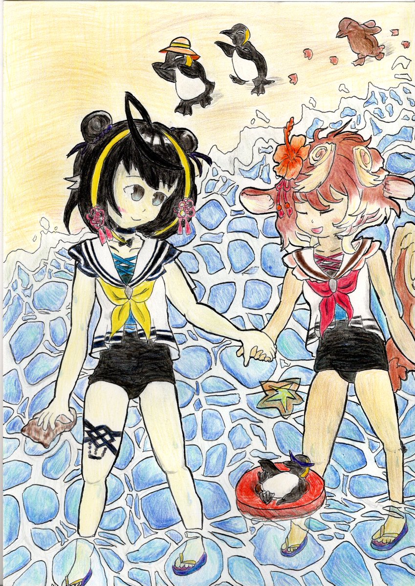 お揃いの水着を……! というのが母様の所望だったので。。 貝殻で指を切らないか心配していたから、サンダル? も着用 でも、シュリにはフリルのついているものの方が似合うかなーなんて…… 祖父様(パパ)的感想 #ミストレイラスト #アサヒカワ #シュリ