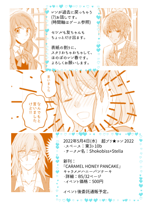 4 16 新刊サンプルをpixivへも追加しました✨ ゲームのレンくんルート10月頃に戻ってしまう話です。スータセシルも出さなきゃ、という謎の使命感で一瞬出てきますw キャラメルハニーパンケーキは、昔デニーズでよく食べたメニューです。甘々な音の響きが好き🥞 22/05/01 23:11