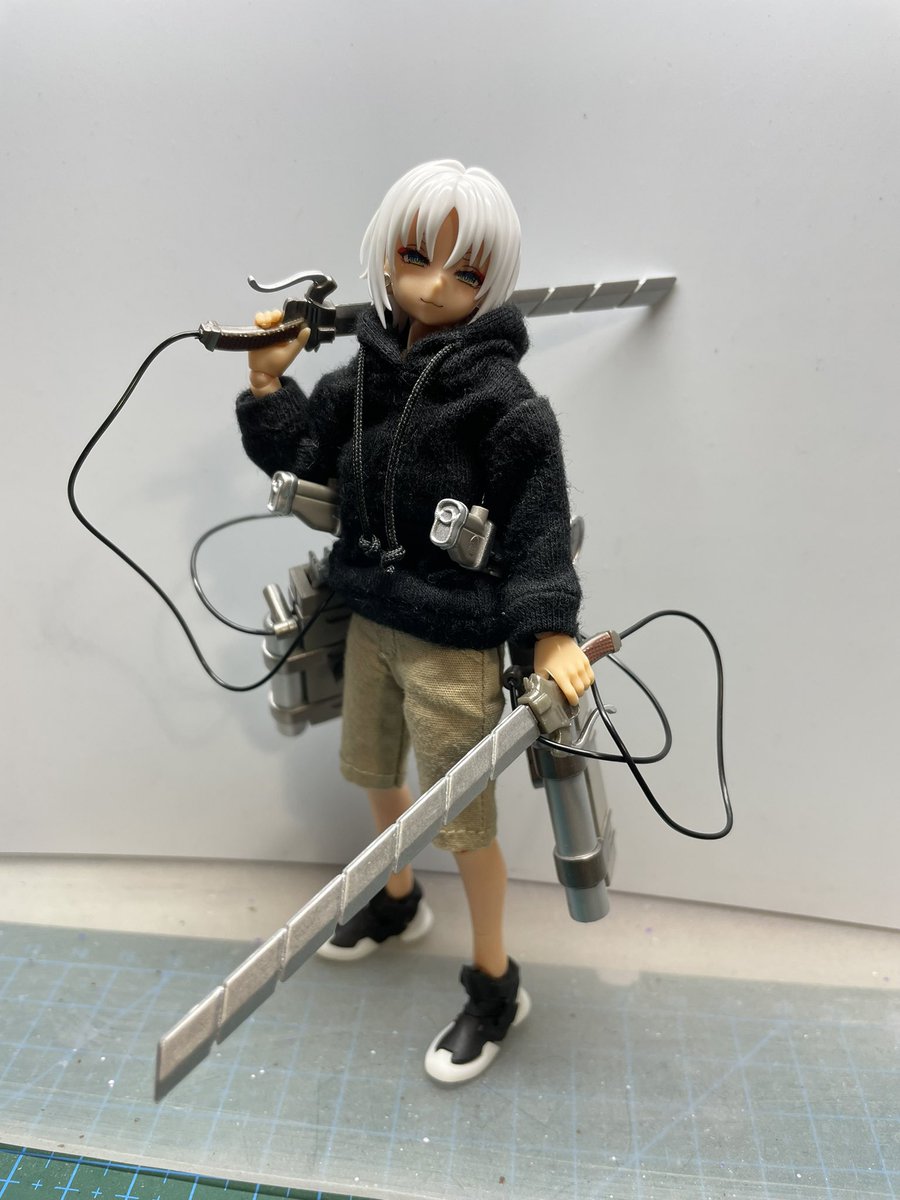 1 11 近くのデパートに行ったら立体機動装置のガチャガチャがラスイチだったのでせっかくだから回してみた ブレード2本+雷槍4本のが当たったけど、雷槍4本は留め具の間隔が微妙っすな… しかし黒パーカーはホコリが乗ると目立っていけねぇ #進撃の巨人 #メガミデバイス 22/03/16 20:32
