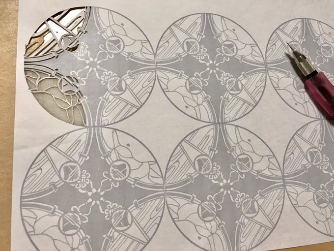 去年は長義くんの帯作ったので、今回国広くんイメージの帯の型作ってます。長義くんの模様の雰囲気と対になるようにしつつ、こちらは七宝紋様にしています。 上手くいくといいな〜 twitter.com/666pack_666/st…