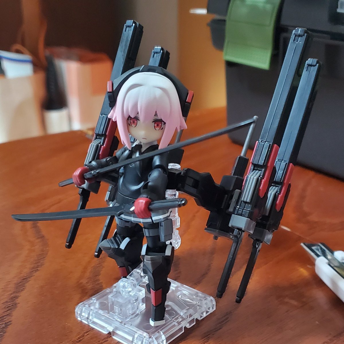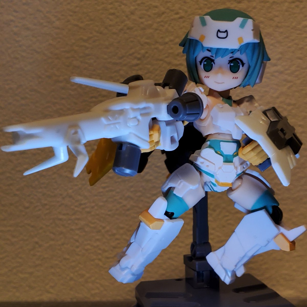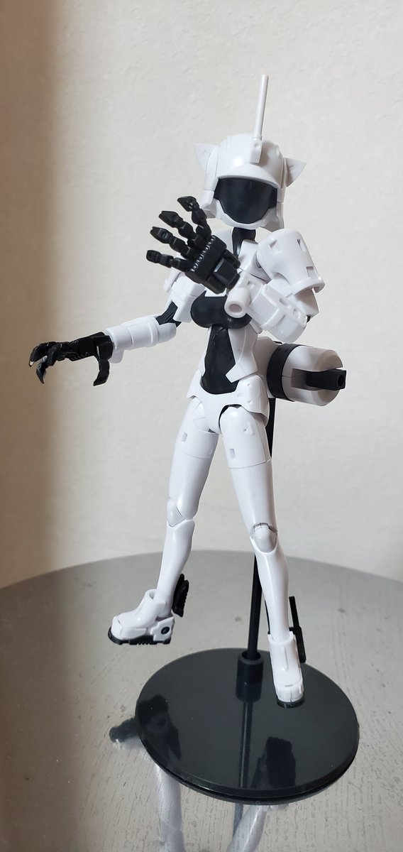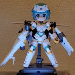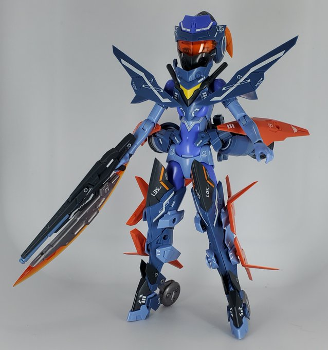 #メガミデバイス #SOLロードランナー 改、完成です。 SOLフルアーマーから防御を捨て、機動力向上のため、可変翼とバランサーとして全身にウイングアーマーを分散配置。 ウイングアーマーは切りつけにも使用できる。 武装はブレードライフル、背面ラックにハンドガン×2、レーザーソード×2。