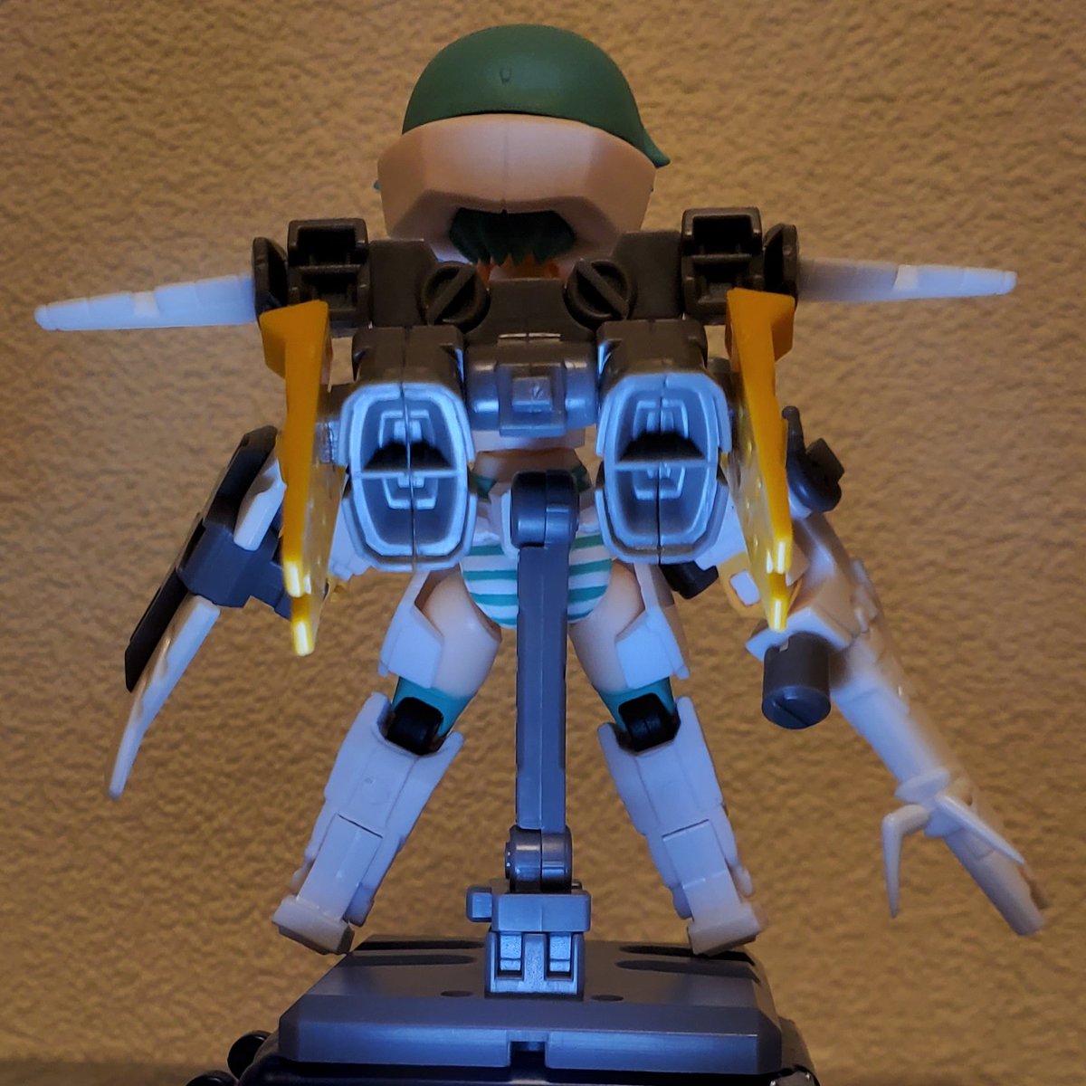 シル轟雷をフォロワーさんよりお譲りいただいたので、組み立てついでにエールストライカー風アプリを作成。 高出力エネルギーライフルとシールド、飛行に最適化したバックパックにより高機動戦闘を行う。 格闘兵器がないのが弱点。 #デスクトップアーミー