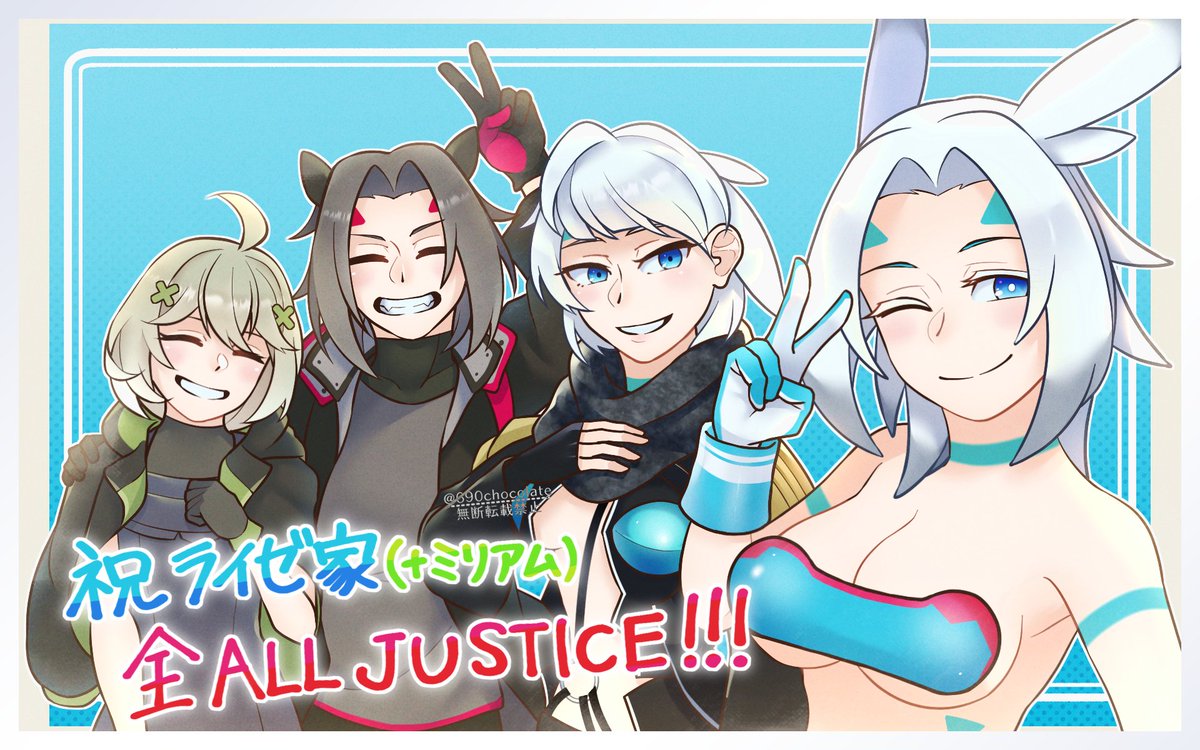 ライゼ家(+ミリアム)全ALL JUSTICE記念絵!!✨ やっとできた…Blessed Rainから長いこと経っちゃったけど描けてよかった😭今までもこれからもみんな大好きだよ~~! #CHUNITHM #CHUNITHM_art twitter.com/690chocolate/s…