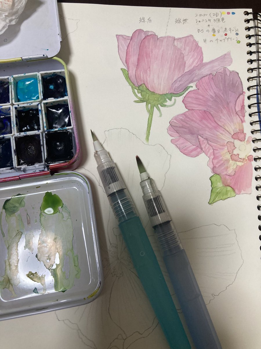 芙蓉(フヨウ)にハマって芙蓉をいっぱい描いてます😌木槿(ムクゲ)に似てるけど木槿より断然好きな形😌2枚目は大きい方がコピー用紙に描いたもので右の水彩紙に移行中です。 #イラスト #ド直球に言いますがフォローしてください #絵柄好みって人にフォローされたい
