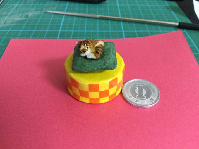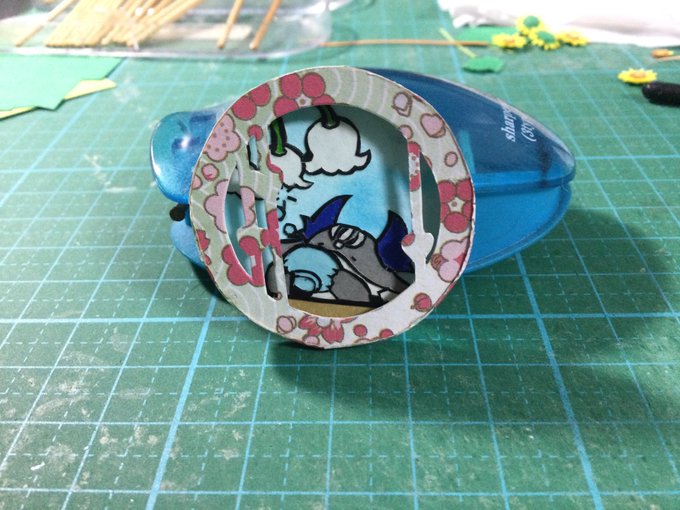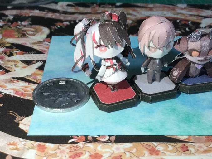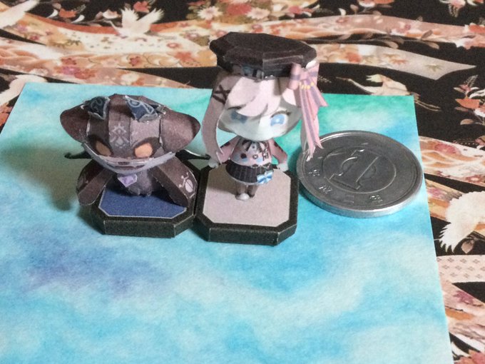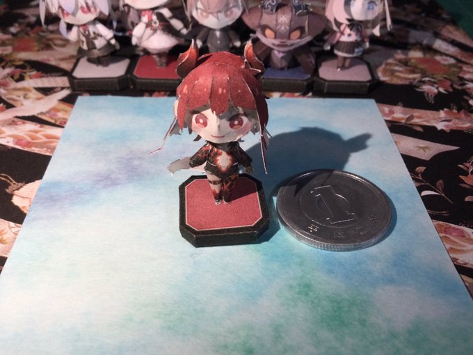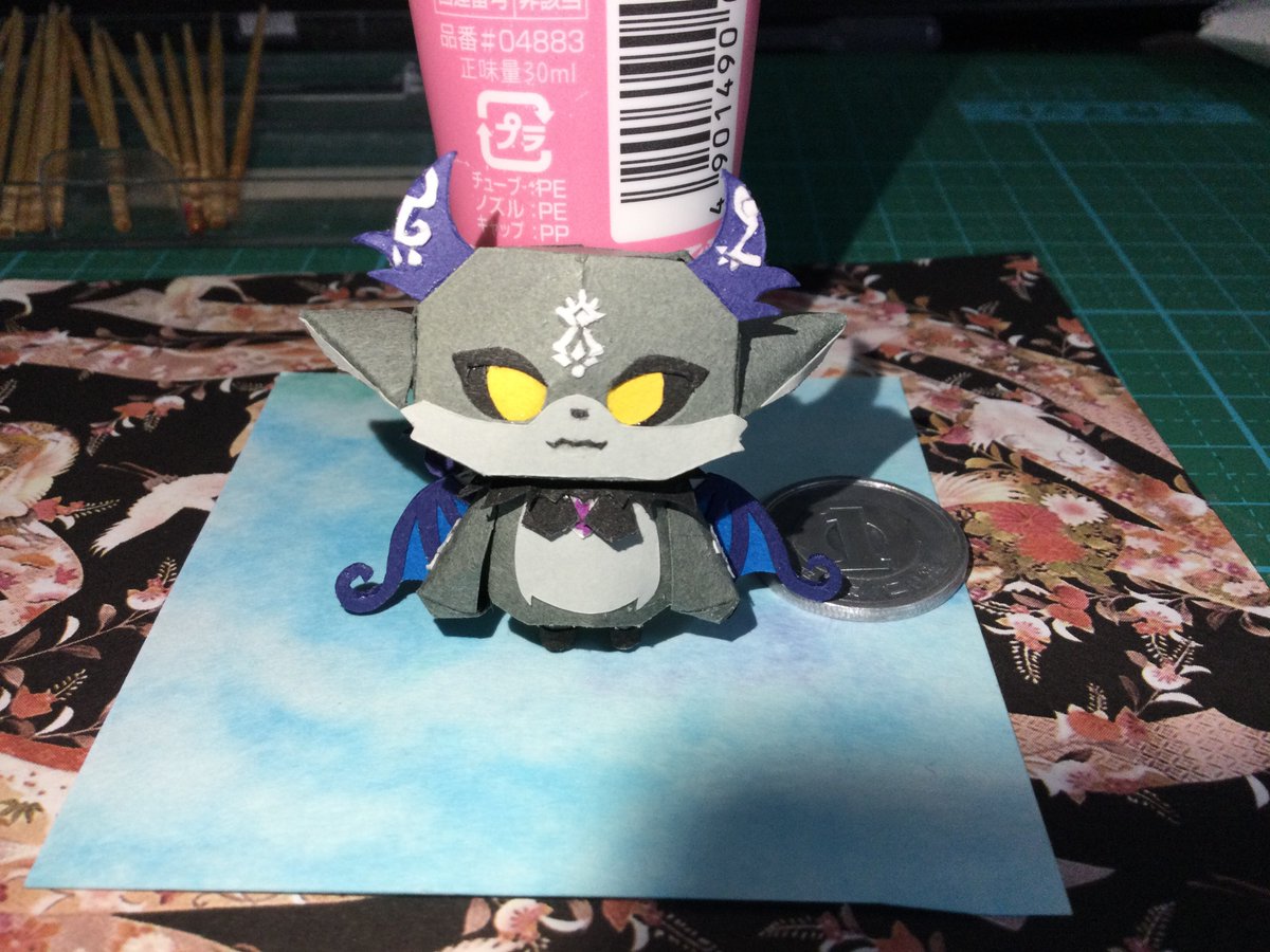 試作品完成したけども よく見たら羽角の位置が逆だったりと色々改良点がありすぎる 試作品で気づいて良かった('A`) 全体的には良い感じ 絵も直して大きさも更に小さくするお #ペーパークラフト #papercraft #でびさまにささげるえ