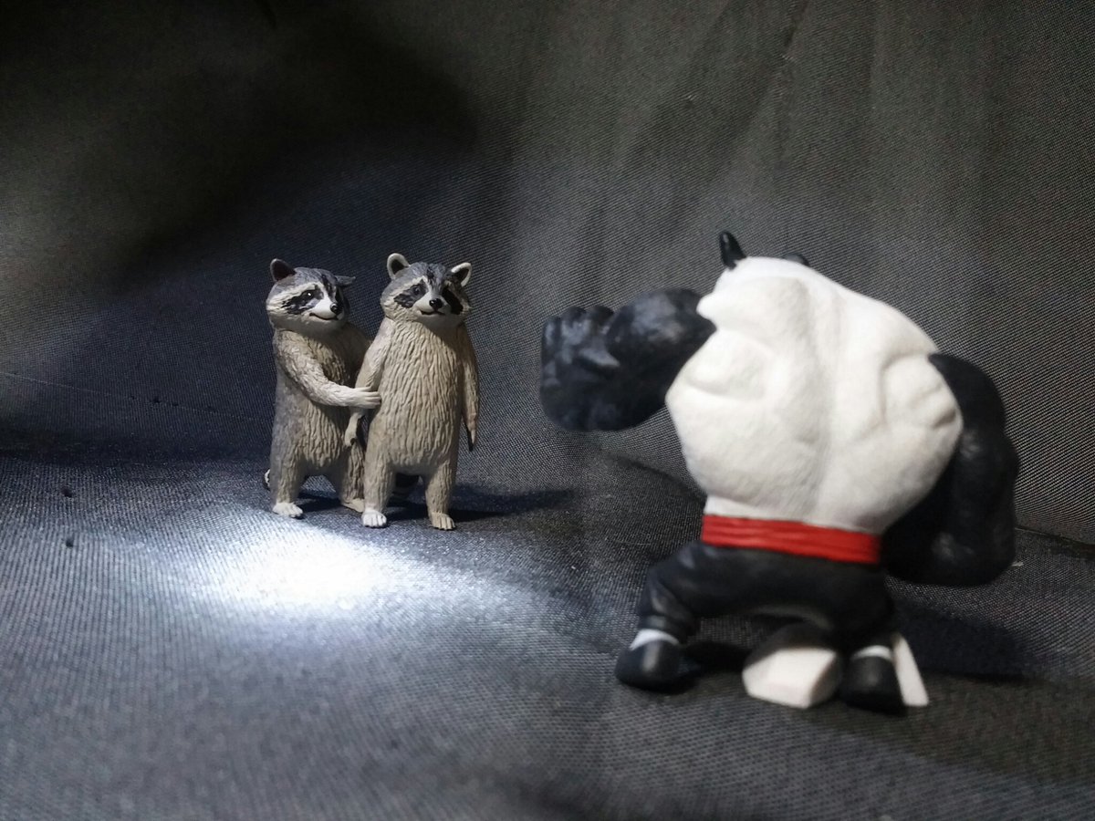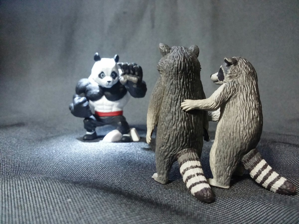 #おもちゃ撮影会 6/23(水)テーマ 『おもちゃ フリー』 やめときなよシリーズその1 「あんちゃん!ストリートファイターに喧嘩売るなんて、正気の沙汰じゃないよ! やめときなよっ!」 #中に人が入ってるアライグマ