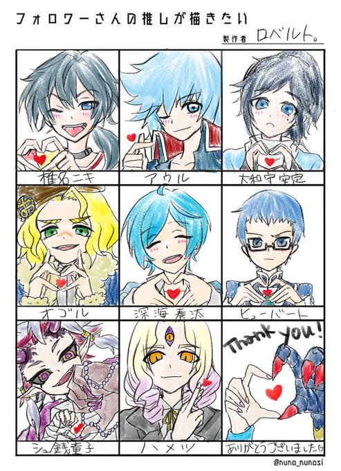 やっと…終わりました…!! 最初の4人以外はちょっとツイートを 拝見させて頂きまして… おそらく推しだろう!!!と思った キャラを描かせて頂きました…! 勝手にごめんなさい💦 みなさん!! リクエストありがとうございました😊 #フォロワーさんの推しが描きたい