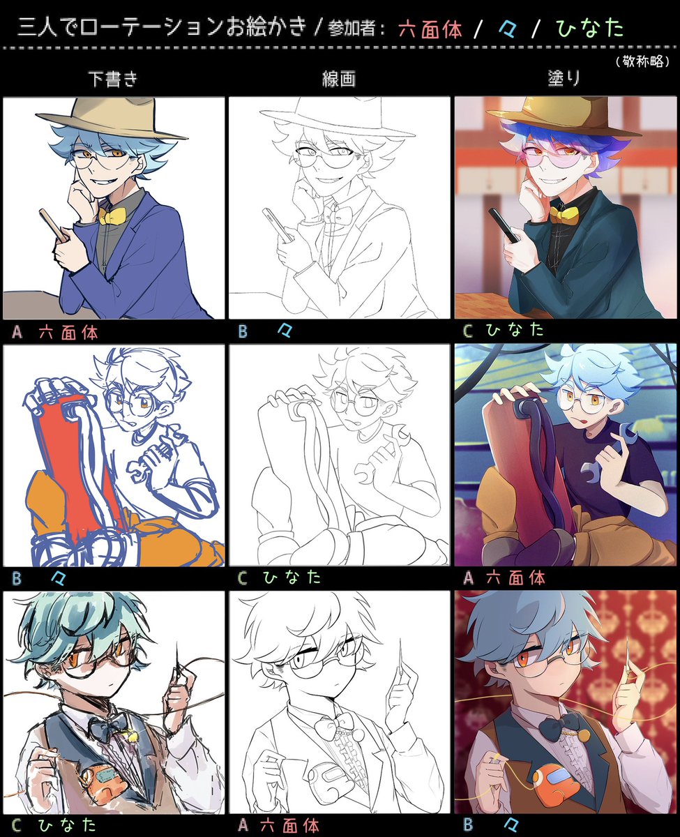 々(@ p1POCOc1 )さん、ひなた(@ H1na_ru )さんと一緒にローテーションお絵描きしました〜‼️ 唐突な誘いに乗ってくれてありがとう!! 良〜ノが沢山できたので見てくれ〜!