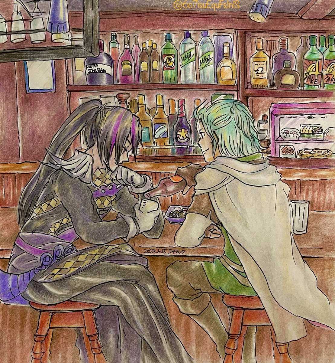 #2023年自分が選ぶ今年上半期の4枚 前回のお気に入り4枚タグ、企画絵とは別に絞ると、飲み食いしてる絵ばっか描いてました🍺 ①サガスカ主人公×酒シリーズ ②アイアンシェーフ!知ってる人いて嬉しいです ③施設メンバー、ほぼ続投でしたね☺️ ④背景に気を取られて主役が淡くなっちゃいました…