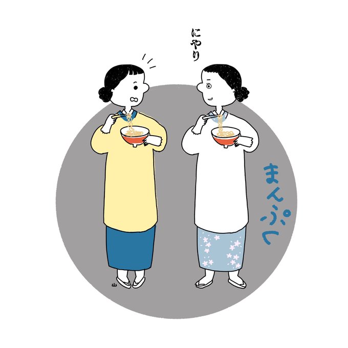本日は「いい夫婦の日」ということで、ぷく絵は萬平さん・福ちゃん夫婦。ふたりの服を、チキンラーメンパッケージ柄のペアルックにしてみました。 #まんぷく #まんぷく絵 #ぷく絵 #いい夫婦の日