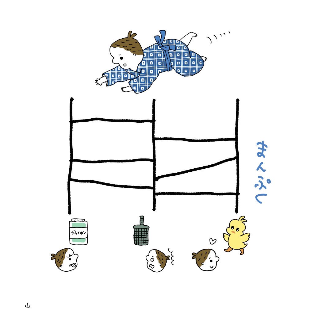 今日のぷく絵は、源くんあみだくじ。あたりはひよこちゃん。それにしても、手榴弾やダネイホンに囲まれて成長していったのか…。そのうち動き回るようになるかと思うとたのしみ。 #まんぷく #まんぷく絵 #ぷく絵