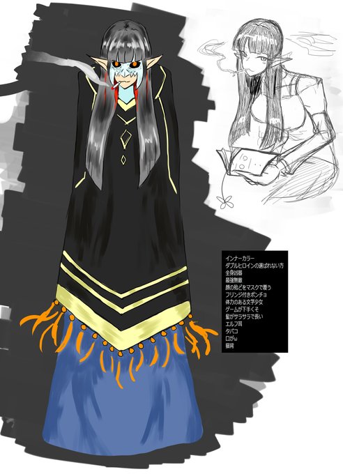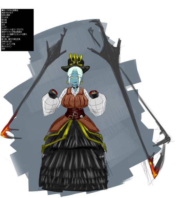 なんかしっくりこない、シルエットが地味になってしまった。要素もそれほど回収できず、消していい数以上に採用できなかった。 今回のお題は、噛み合わせが悪いか、己が実力が足りないようだ。 #幽焼け #最強ヒロインを作ろう