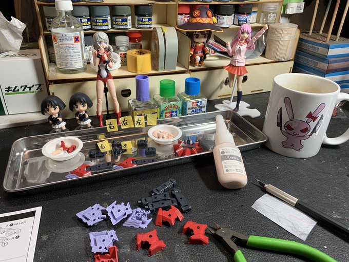 素体の組み立てが終わり、武装の組み立て。 ここでいつもペースが落ちる。 同じもの何個も作るの苦手、 #メガミデバイス