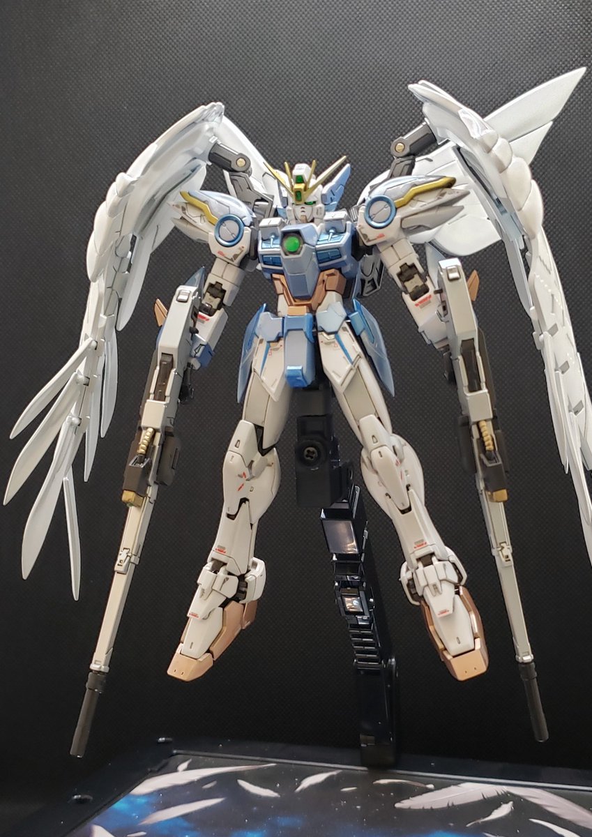 みなさんこんばんは☺ 2022年内に仕上げる予定だったRG ウイングガンダムゼロ完成しました! スノーホワイトバージョンで完成予定でしたが予想よりも青味が強く出すぎたのでカラーアレンジしました☺ #ガンプラ好きと繋がりたい #ガンプラの画像貼るとRTされると聞いて #ガンプラは自由だ