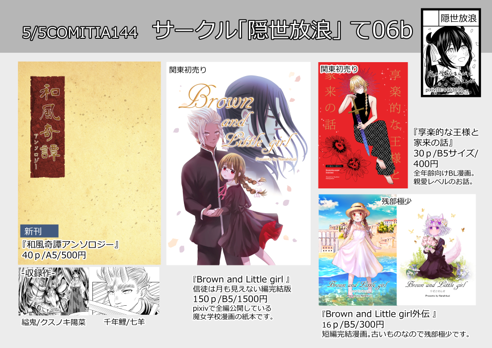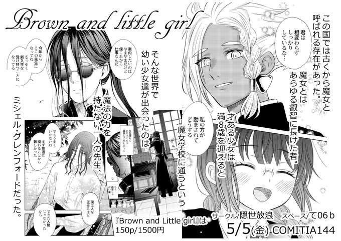 🌙COMITIA144既刊紹介🌙 『Brown and Little girl』 魔女学校に入ったばかりの幼い少女達と魔法の力を持たない訳ありな先生のお話。 今年1月に完結した150p長編漫画の紙本です。pixivで本編全公開しています。絵の加筆修正有。 pixiv.net/user/4463190/s… #COMITIA144 #コミティア144