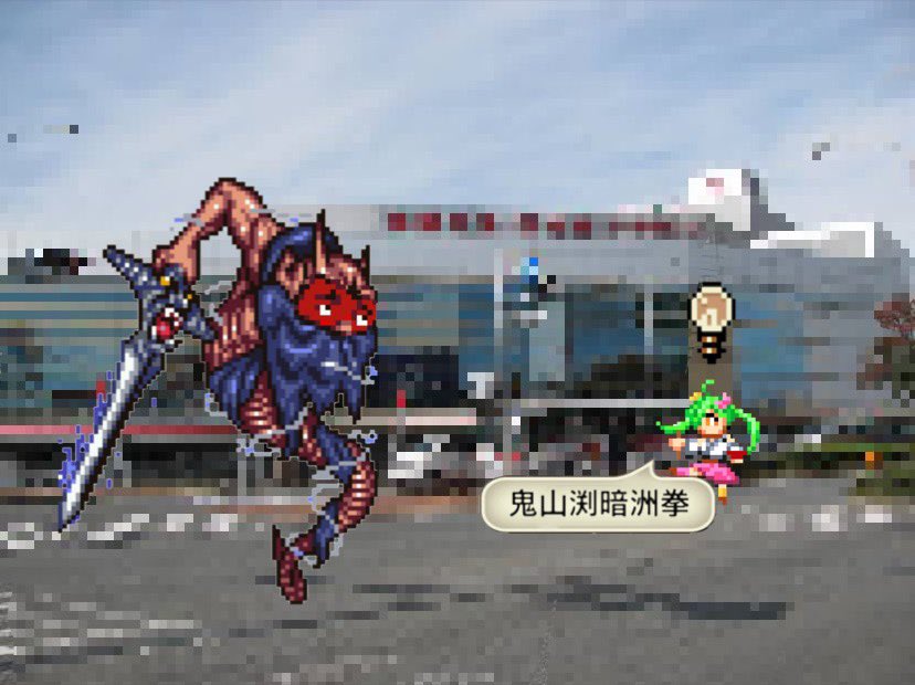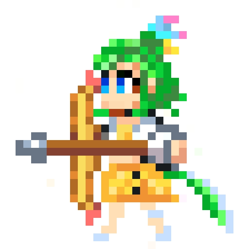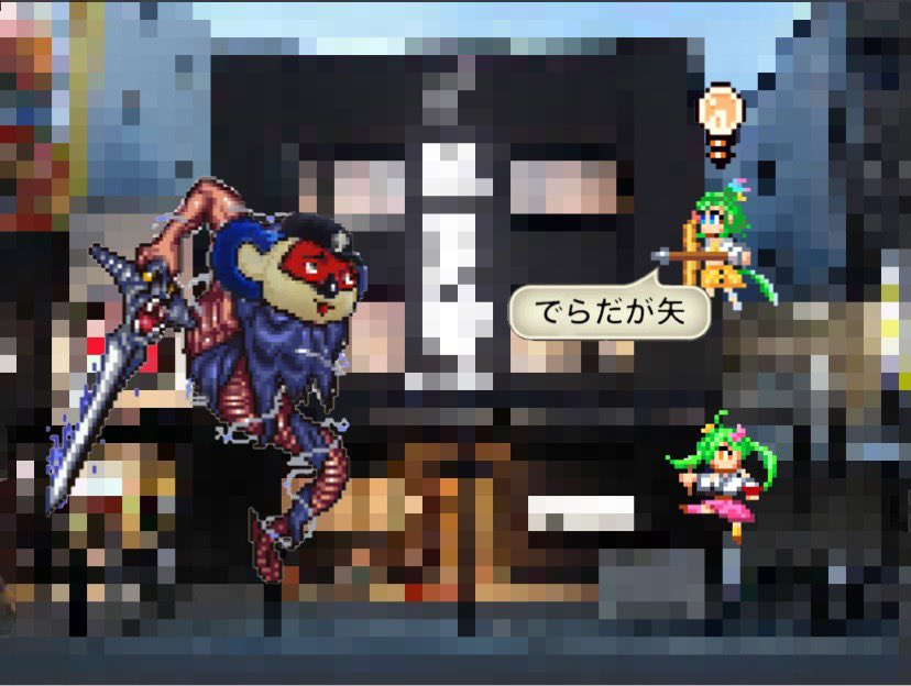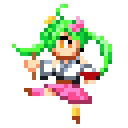 ドット絵で舞鶴よかとちゃん描きました。右手に箸、左手にドンブリ。ついでに謎のどんたくマンと戦わせてみた。 #よかと描いとーと