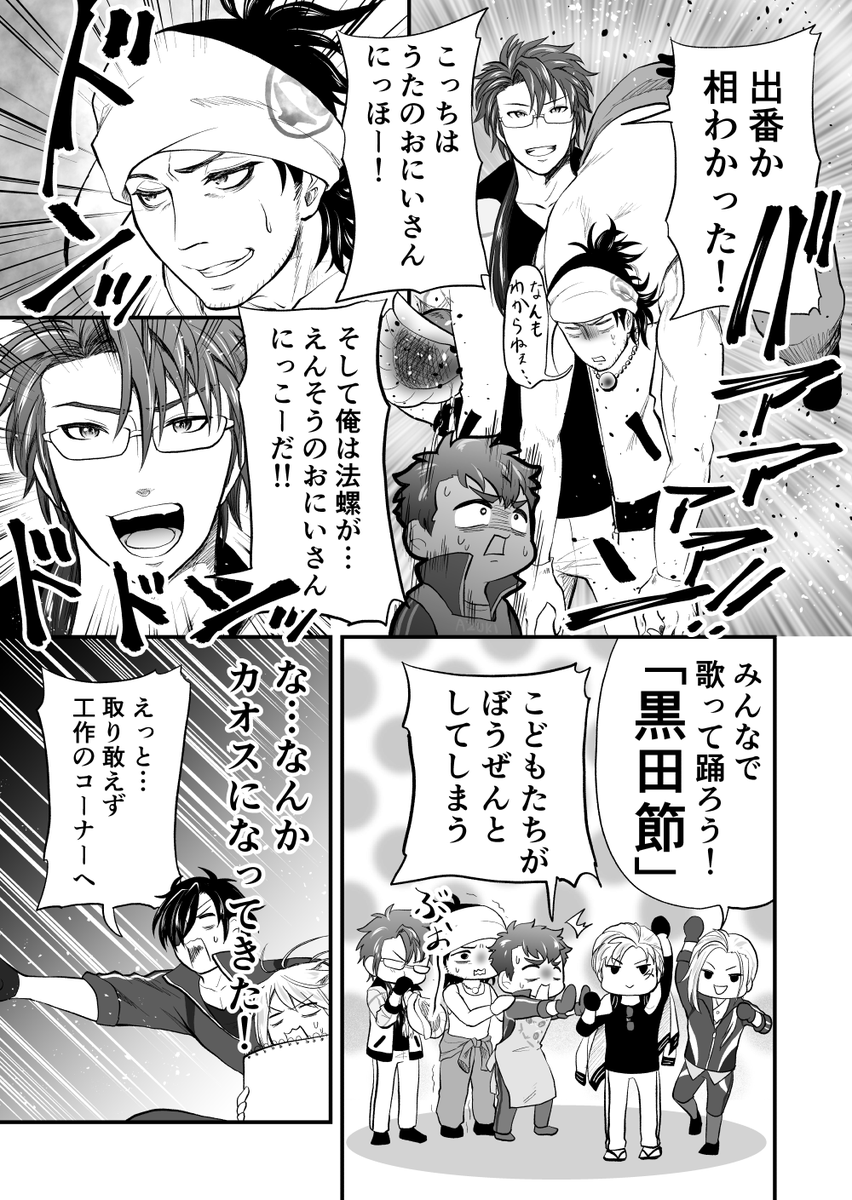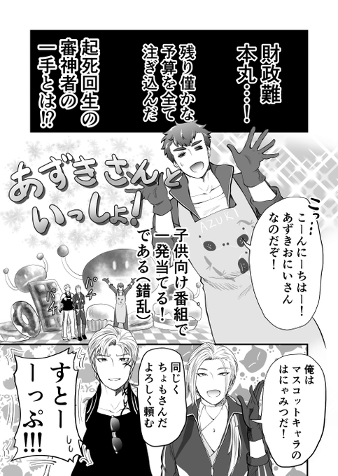 46 89 「絶対に突っ込んではいけない本丸二十四時」14/4(続きはリプに) ~着替えをしよう!~ ※キャラ崩壊&公式にない衣装&某番組のパロディを過剰に含んでおります、注意! あと格好いい男士はいません!何でも許せる人向け 弊本丸のツッコミ担当は小豆さん燭台切さん薬研くん南泉くん日本号さんです 21/12/31 17:23
