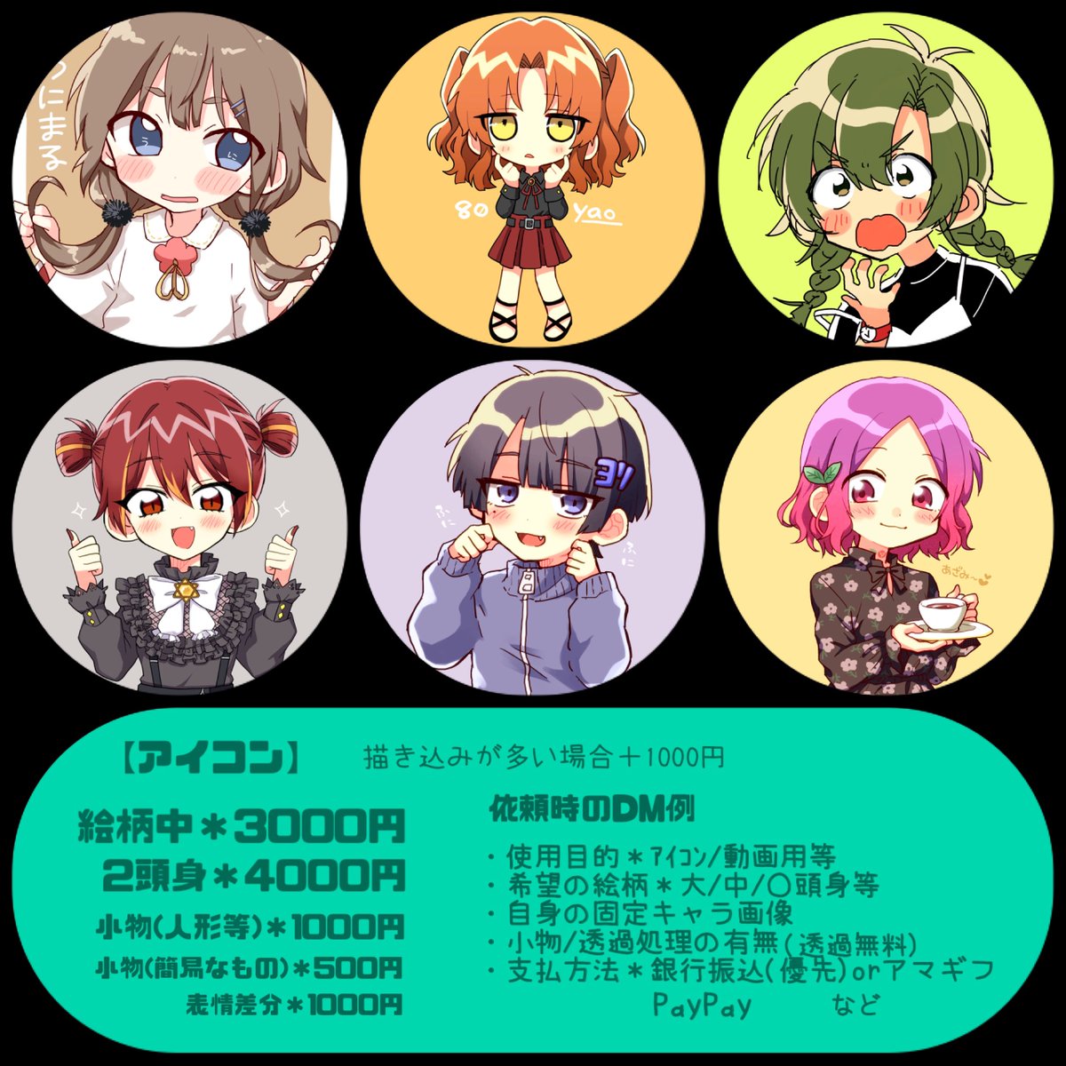 *10/15更新 ご依頼の際、以下詳細をDMまでお願い致します。 ・使用目的*アイコン/動画用等 ・希望の絵柄*大/中/2頭身等 ・小物/透過処理の有無(透過無料) ・自身の固定キャラ画像 ・支払方法*銀行振込、PayPay、アマギフ等 お待ちしてます🍒 #有償依頼 #イラスト依頼 #夢絵依頼