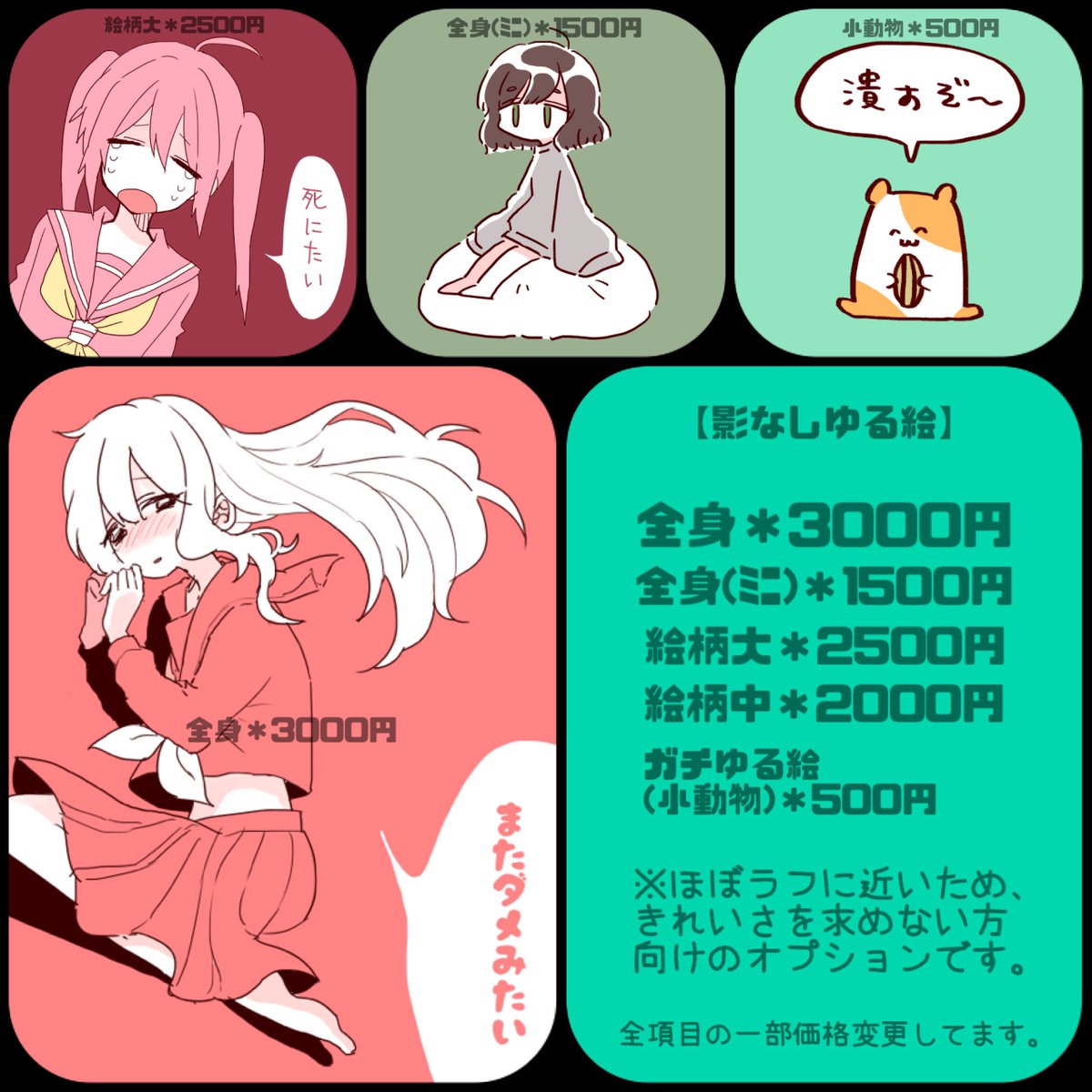 7 18 *10/15更新 ご依頼の際、以下詳細をDMまでお願い致します。 ・使用目的*アイコン/動画用等 ・希望の絵柄*大/中/2頭身等 ・小物/透過処理の有無(透過無料) ・自身の固定キャラ画像 ・支払方法*銀行振込、PayPay、アマギフ等 お待ちしてます🍒 #有償依頼 #イラスト依頼 #夢絵依頼 22/10/15 09:00