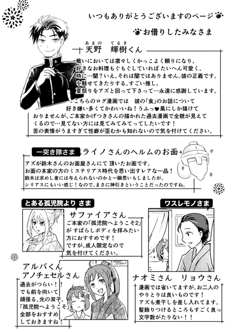いつもありがとうございますのページ! 泣く泣く色々削っているのでログもぜひ〜!の宣伝! ▼かげつきさんによる 英雄RPGログまとめ↓ kagethu.yokinihakarae.com/AURPG/index.htm ▼下記ページの後半〜花火大会までの3pが今回描かせて頂いた部分です↓ kagethu.yokinihakarae.com/AURPG/405.htm