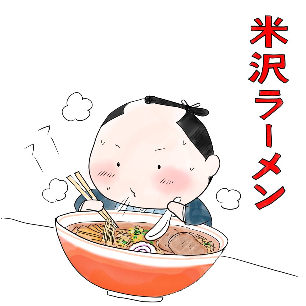#山形 #イラスト #上杉鷹山 「鷹山公が現代の美味しい物を食べに行くシリーズ。」 #玉こんにゃく #米沢ラーメン