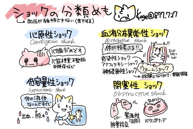 【ショックの分類メモ】 血圧が維持できない(低下する)のがポイント(尿量も減る) ↓言葉だけで見ると看護国試に出た〜ショック ・心原性ショック ・循環血液量減少性ショック ・出血性ショック ・敗血症性ショック ・エンドトキシンショック ・アナフィラキシーショック ・神経原性ショック