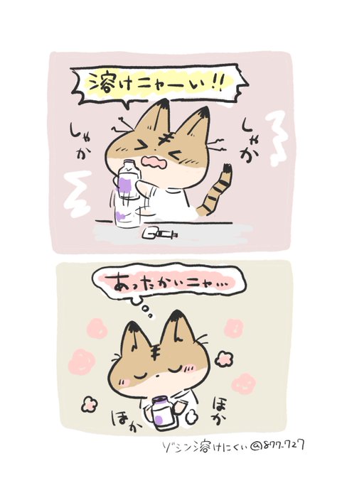 36 223 こちらはゾシン(タゾピペ)が溶けにくくて苦戦するけど溶けたあとはバイアルがあたたかくなっててちょっとほっこりするにゃんごしチャンのおしごと応援イラストです 23/02/27 06:01